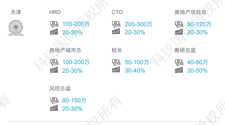 天津整体薪资呈现上涨的趋势,尤其金融、教育、高科技等行业,核心岗位如在线教育的教学教研岗、AI算法、底层开发架构等岗位跳槽涨幅可达30-50%。本数据来源于猎头公司VSPORTS(中国)国际资深行业专家对2021年热门职位薪酬范围及跳槽涨幅的预测,供HR和猎头招聘参考。